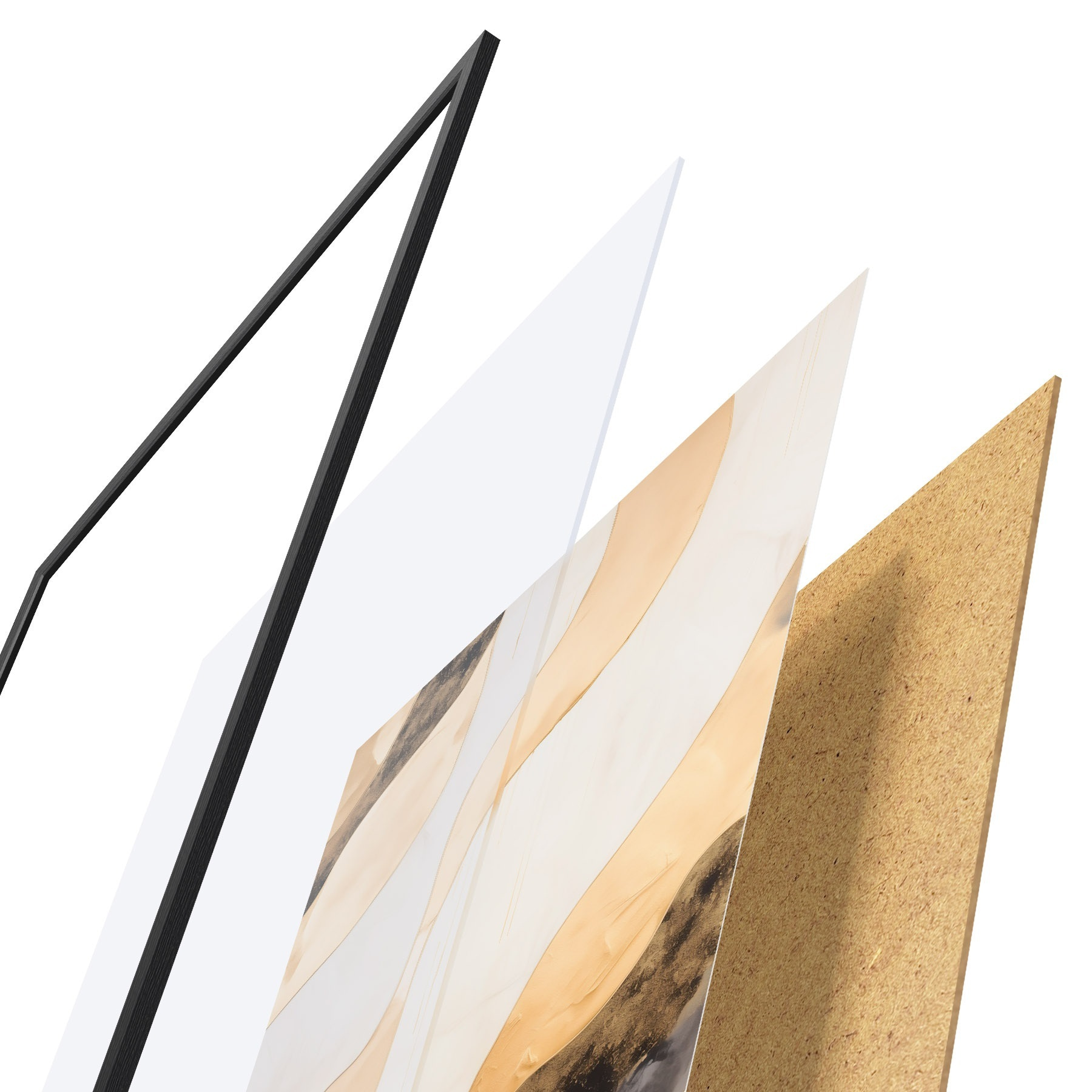 De poster bestaat uit een frame, plexiglas, geprinte afbeelding en spaanplaat achterkant. De poster kan meteen aan de muur worden gehangen dankzij de bevestigingen op de achterkant.