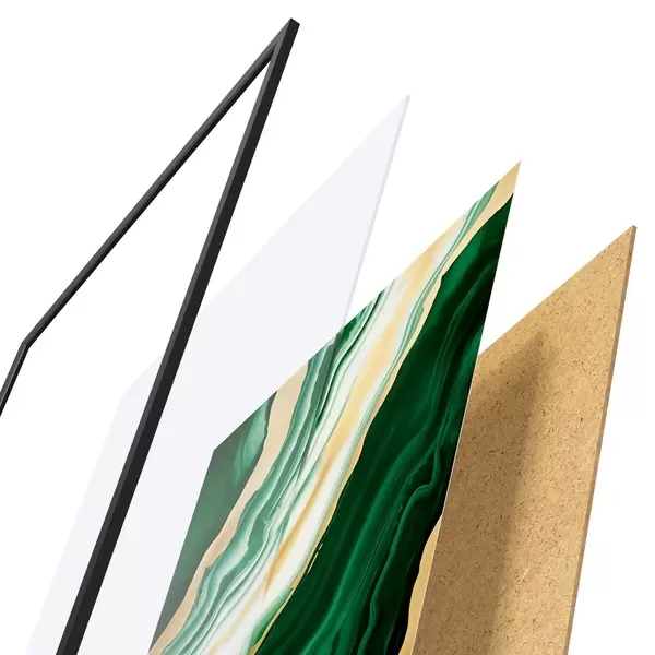 De poster bestaat uit een frame, plexiglas, geprinte afbeelding en spaanplaat achterkant. De poster kan meteen aan de muur worden gehangen dankzij de bevestigingen op de achterkant.