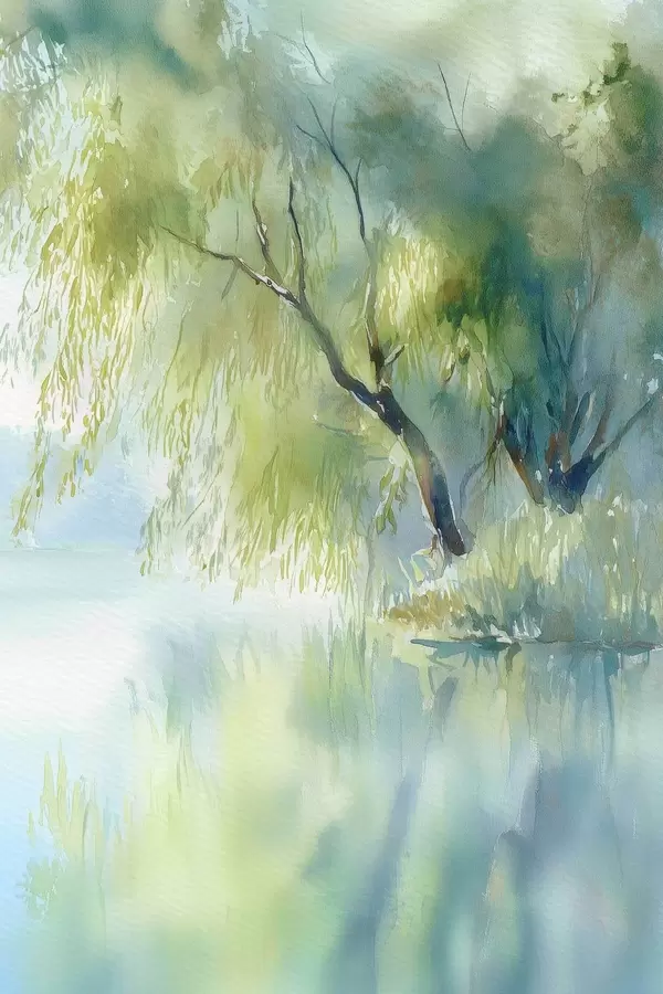 Poster wilgenboom aan de oever van het meer in aquarelstijl Nr f45715