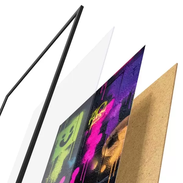 De poster bestaat uit een frame, plexiglas, geprinte afbeelding en spaanplaat achterkant. De poster kan meteen aan de muur worden gehangen dankzij de bevestigingen op de achterkant.
