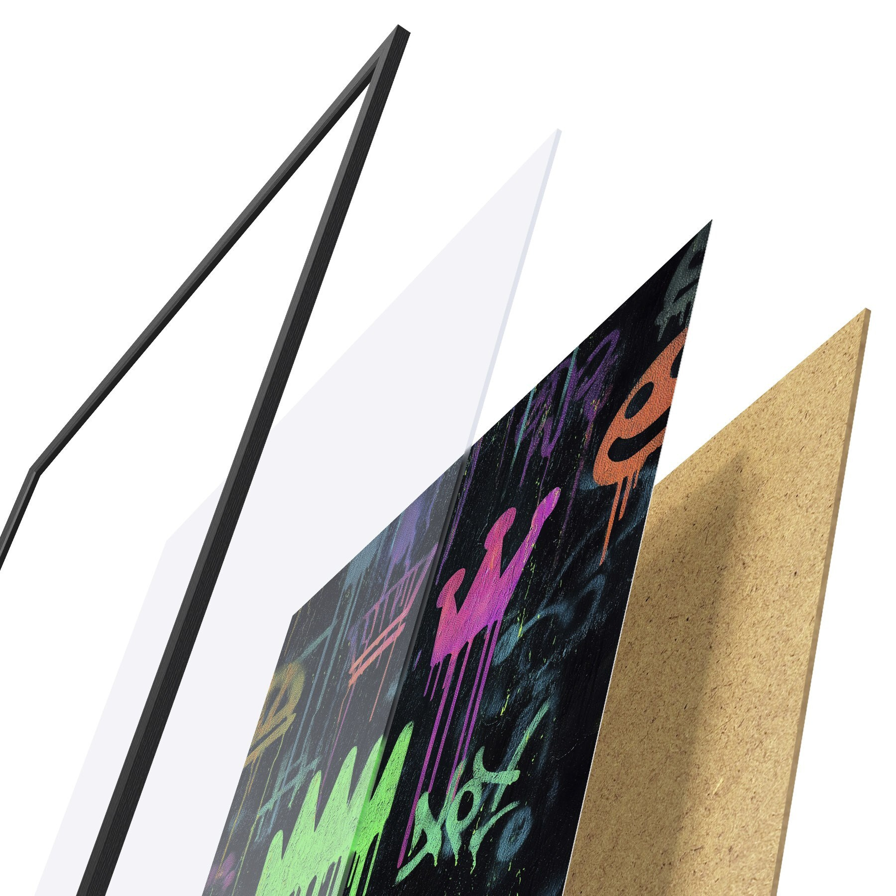 De poster bestaat uit een frame, plexiglas, geprinte afbeelding en spaanplaat achterkant. De poster kan meteen aan de muur worden gehangen dankzij de bevestigingen op de achterkant.