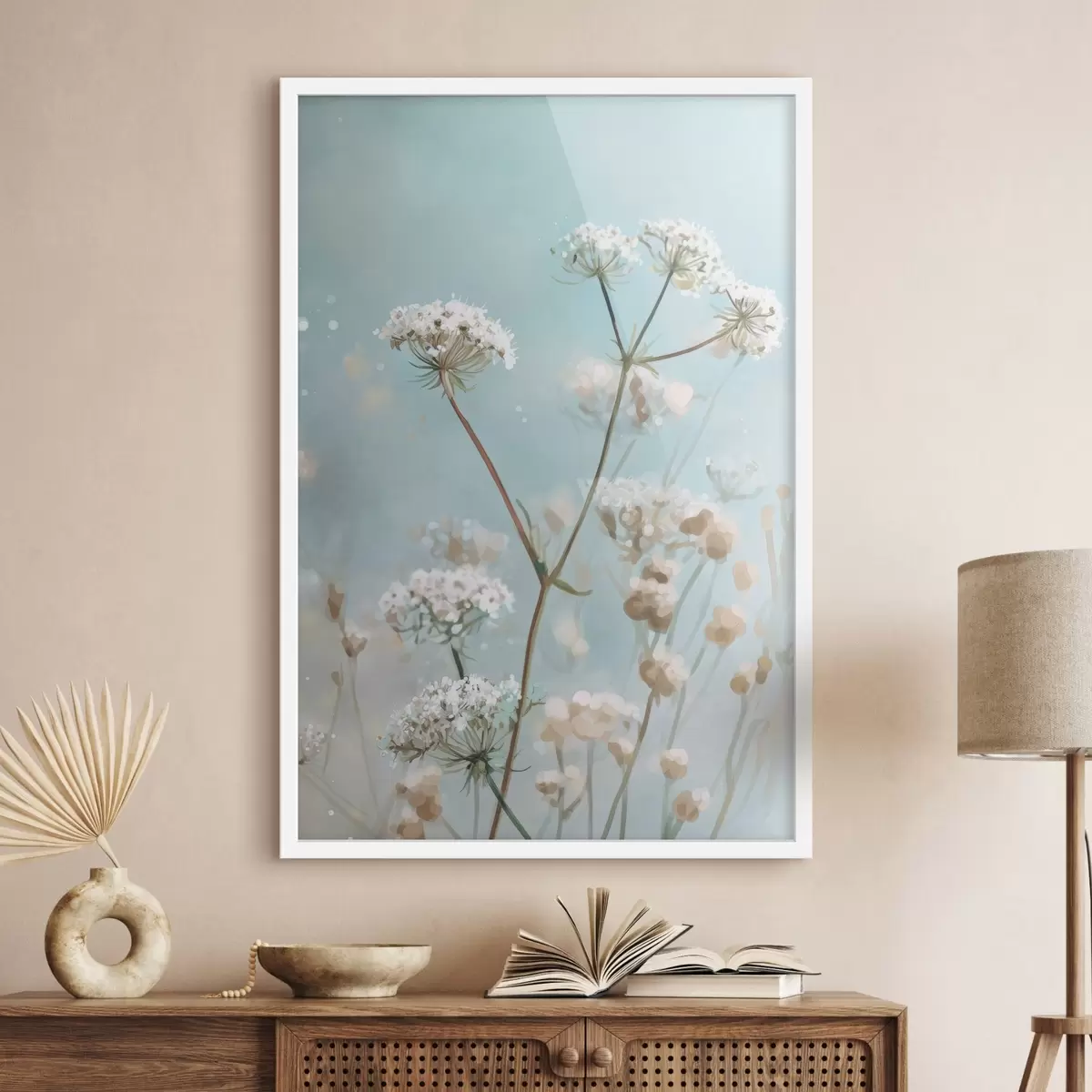 Poster Queen Anne's Lace-bloemen in aquarelstijl op een blauwe achtergrond f45722