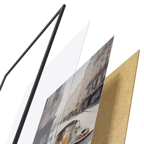 De poster bestaat uit een frame, plexiglas, geprinte afbeelding en spaanplaat achterkant. De poster kan meteen aan de muur worden gehangen dankzij de bevestigingen op de achterkant.
