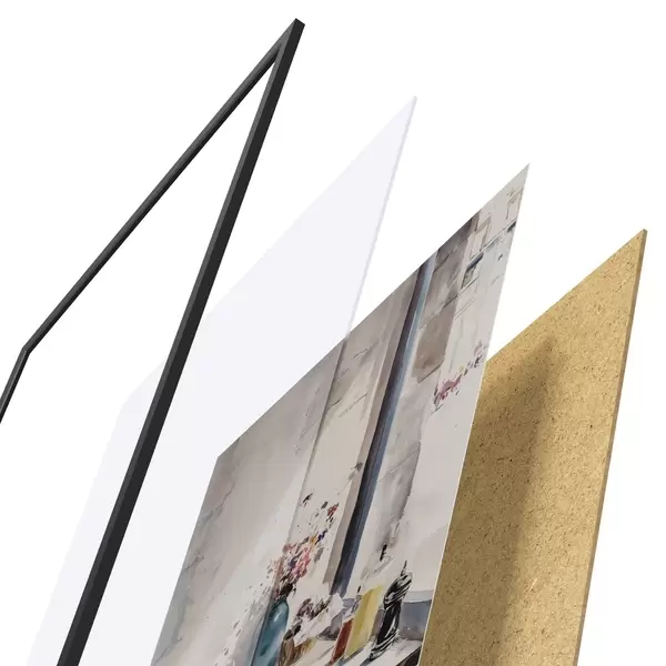 De poster bestaat uit een frame, plexiglas, geprinte afbeelding en spaanplaat achterkant. De poster kan meteen aan de muur worden gehangen dankzij de bevestigingen op de achterkant.