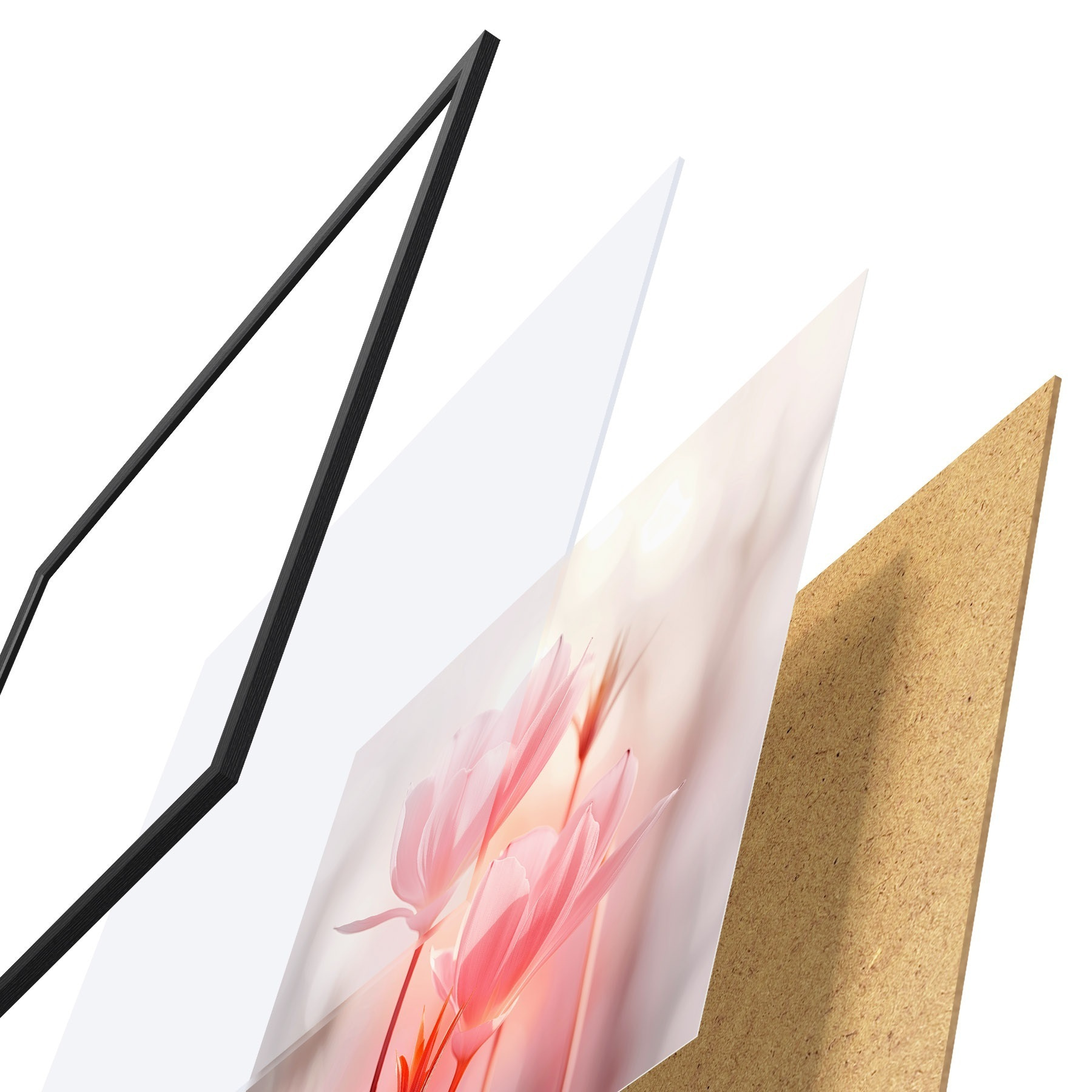 De poster bestaat uit een frame, plexiglas, geprinte afbeelding en spaanplaat achterkant. De poster kan meteen aan de muur worden gehangen dankzij de bevestigingen op de achterkant.