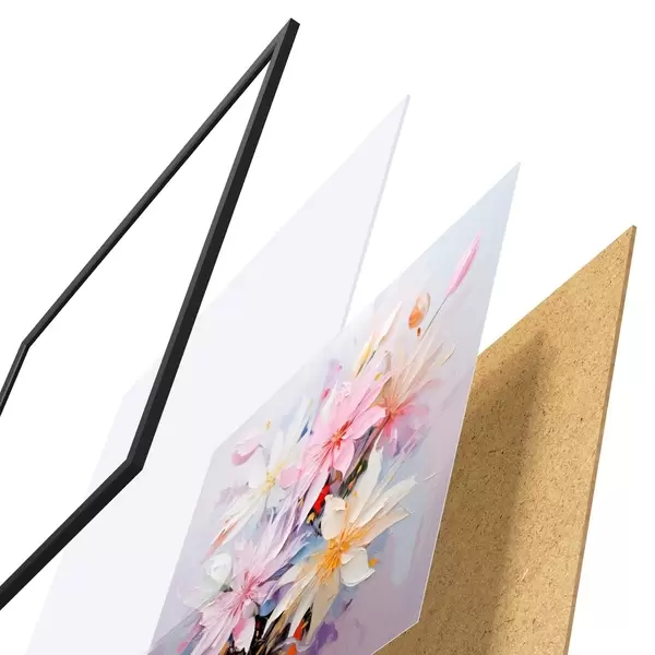 De poster bestaat uit een frame, plexiglas, geprinte afbeelding en spaanplaat achterkant. De poster kan meteen aan de muur worden gehangen dankzij de bevestigingen op de achterkant.