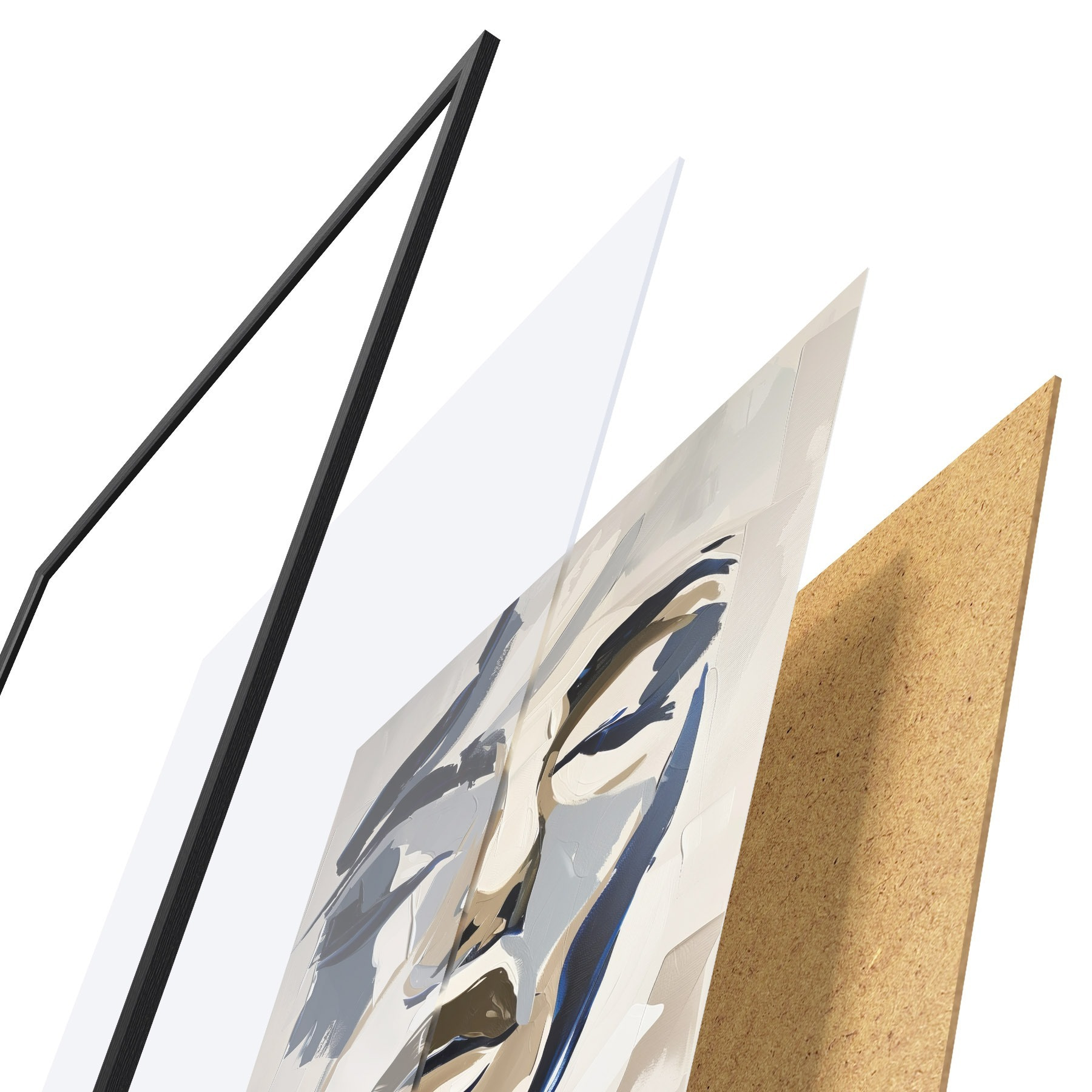 De poster bestaat uit een frame, plexiglas, geprinte afbeelding en spaanplaat achterkant. De poster kan meteen aan de muur worden gehangen dankzij de bevestigingen op de achterkant.