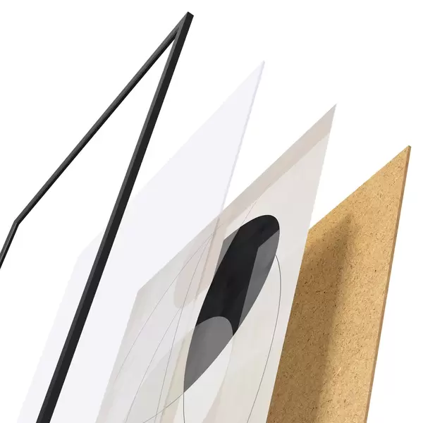 De poster bestaat uit een frame, plexiglas, geprinte afbeelding en spaanplaat achterkant. De poster kan meteen aan de muur worden gehangen dankzij de bevestigingen op de achterkant.