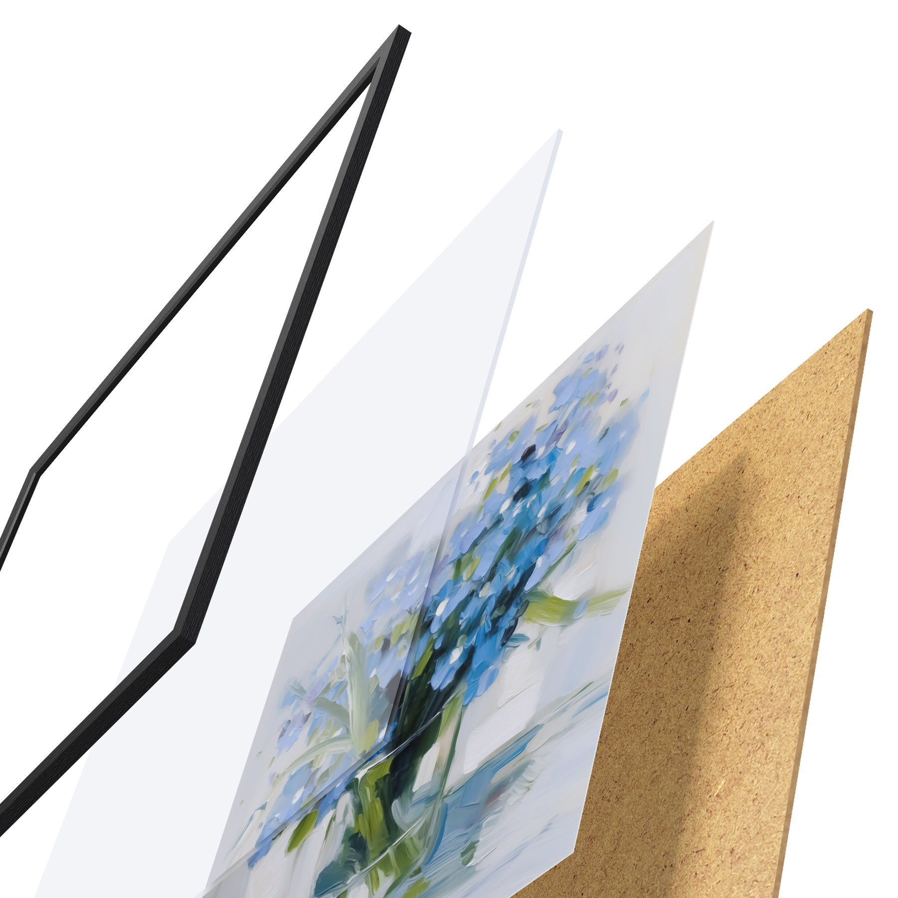 De poster bestaat uit een frame, plexiglas, geprinte afbeelding en spaanplaat achterkant. De poster kan meteen aan de muur worden gehangen dankzij de bevestigingen op de achterkant.
