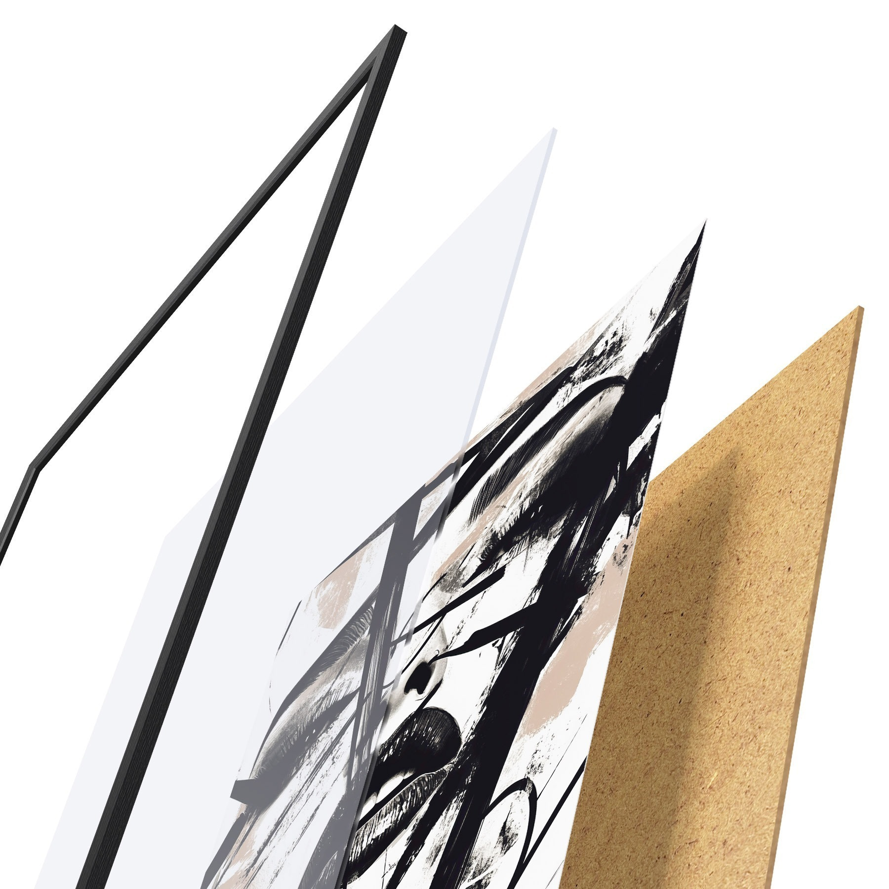 De poster bestaat uit een frame, plexiglas, geprinte afbeelding en spaanplaat achterkant. De poster kan meteen aan de muur worden gehangen dankzij de bevestigingen op de achterkant.