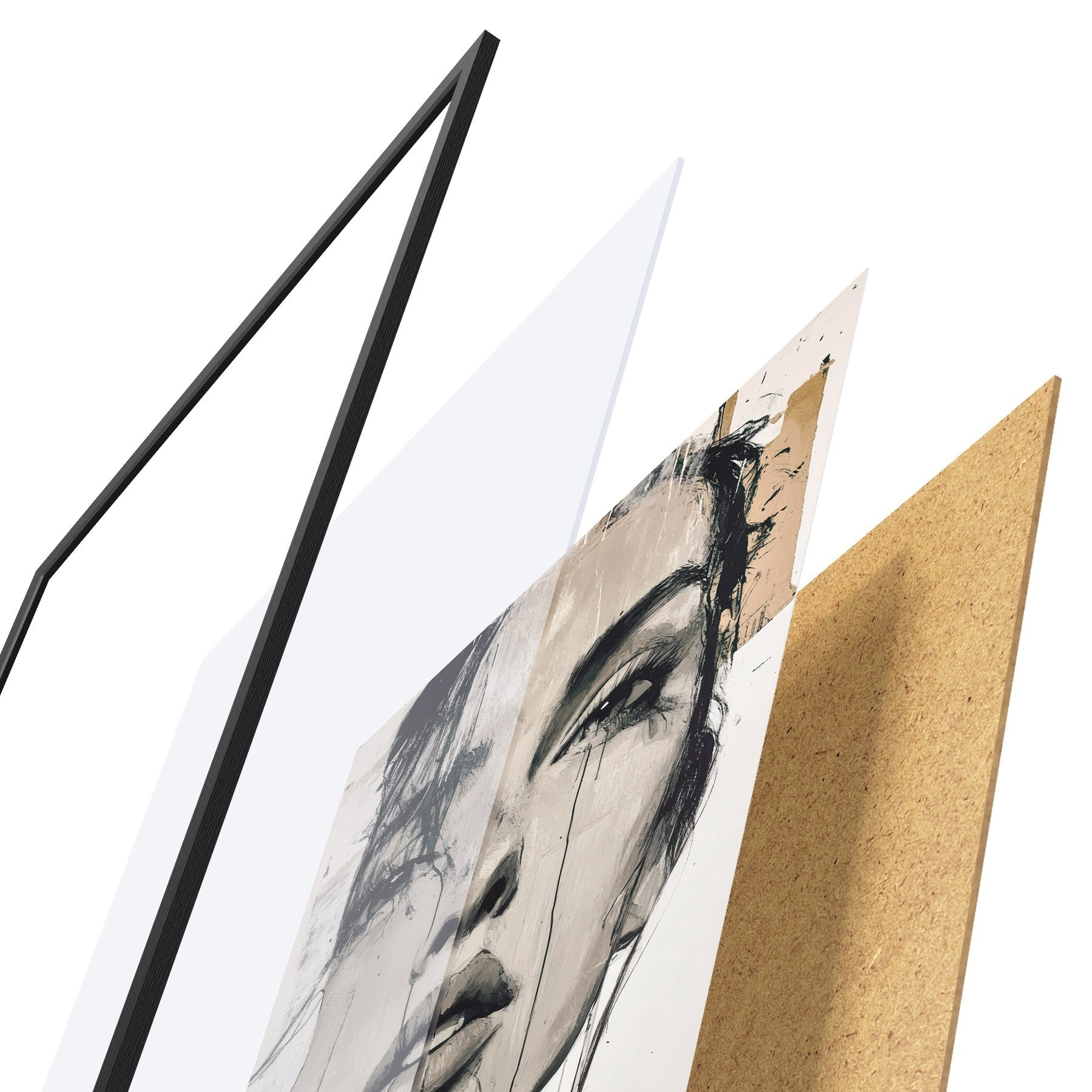 De poster bestaat uit een frame, plexiglas, geprinte afbeelding en spaanplaat achterkant. De poster kan meteen aan de muur worden gehangen dankzij de bevestigingen op de achterkant.