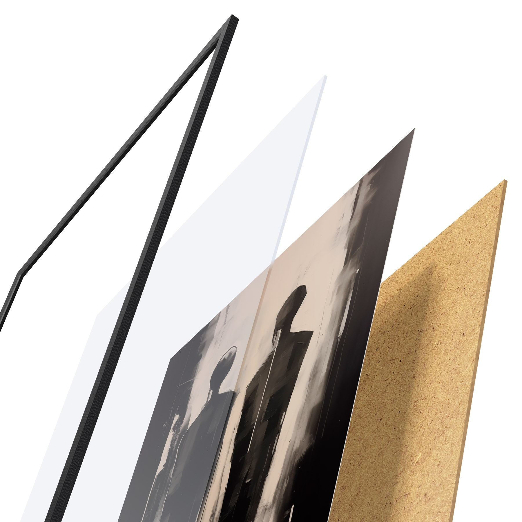 De poster bestaat uit een frame, plexiglas, geprinte afbeelding en spaanplaat achterkant. De poster kan meteen aan de muur worden gehangen dankzij de bevestigingen op de achterkant.