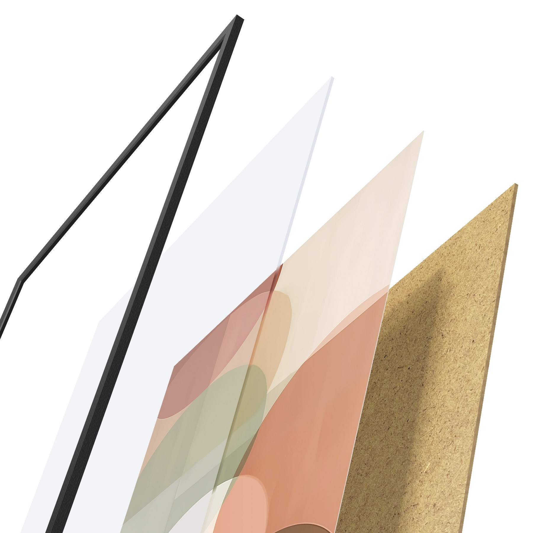 De poster bestaat uit een frame, plexiglas, geprinte afbeelding en spaanplaat achterkant. De poster kan meteen aan de muur worden gehangen dankzij de bevestigingen op de achterkant.