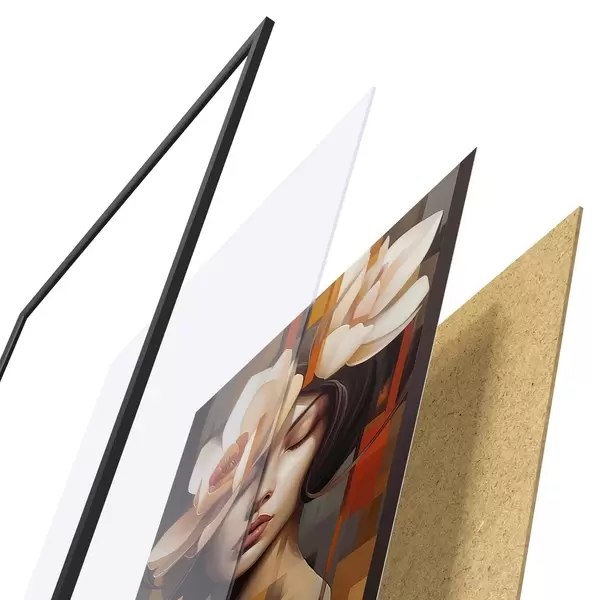 De poster bestaat uit een frame, plexiglas, geprinte afbeelding en spaanplaat achterkant. De poster kan meteen aan de muur worden gehangen dankzij de bevestigingen op de achterkant.