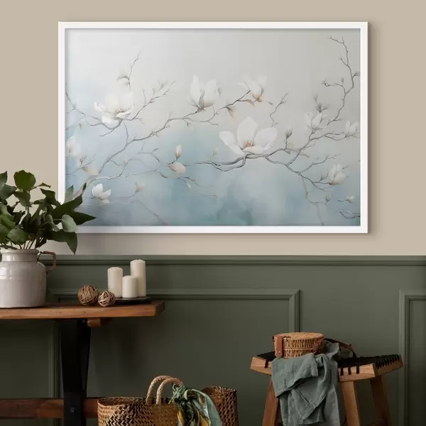 Poster Magnoliatakken met witte bloemen op een delicate achtergrond f45806