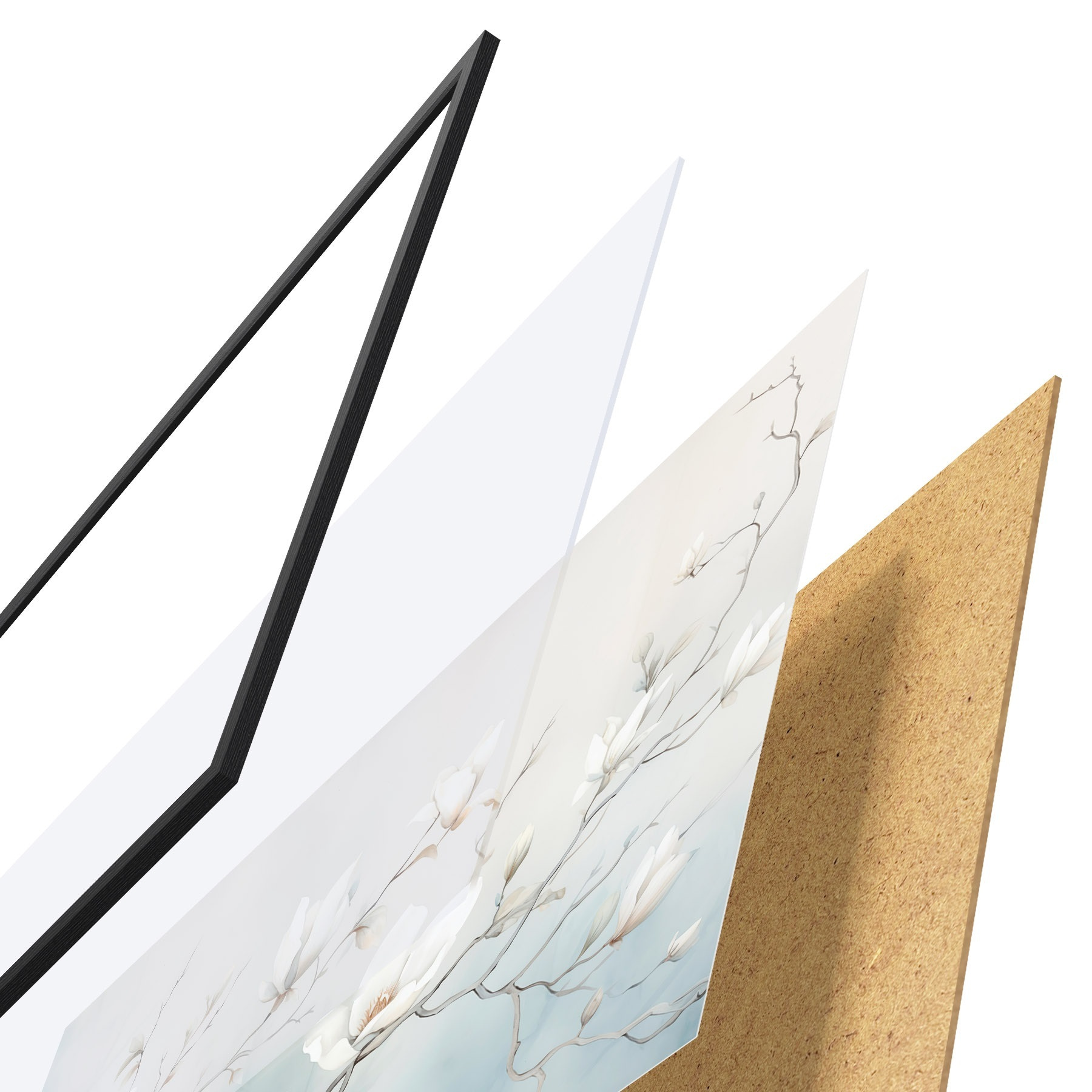 De poster bestaat uit een frame, plexiglas, geprinte afbeelding en spaanplaat achterkant. De poster kan meteen aan de muur worden gehangen dankzij de bevestigingen op de achterkant.