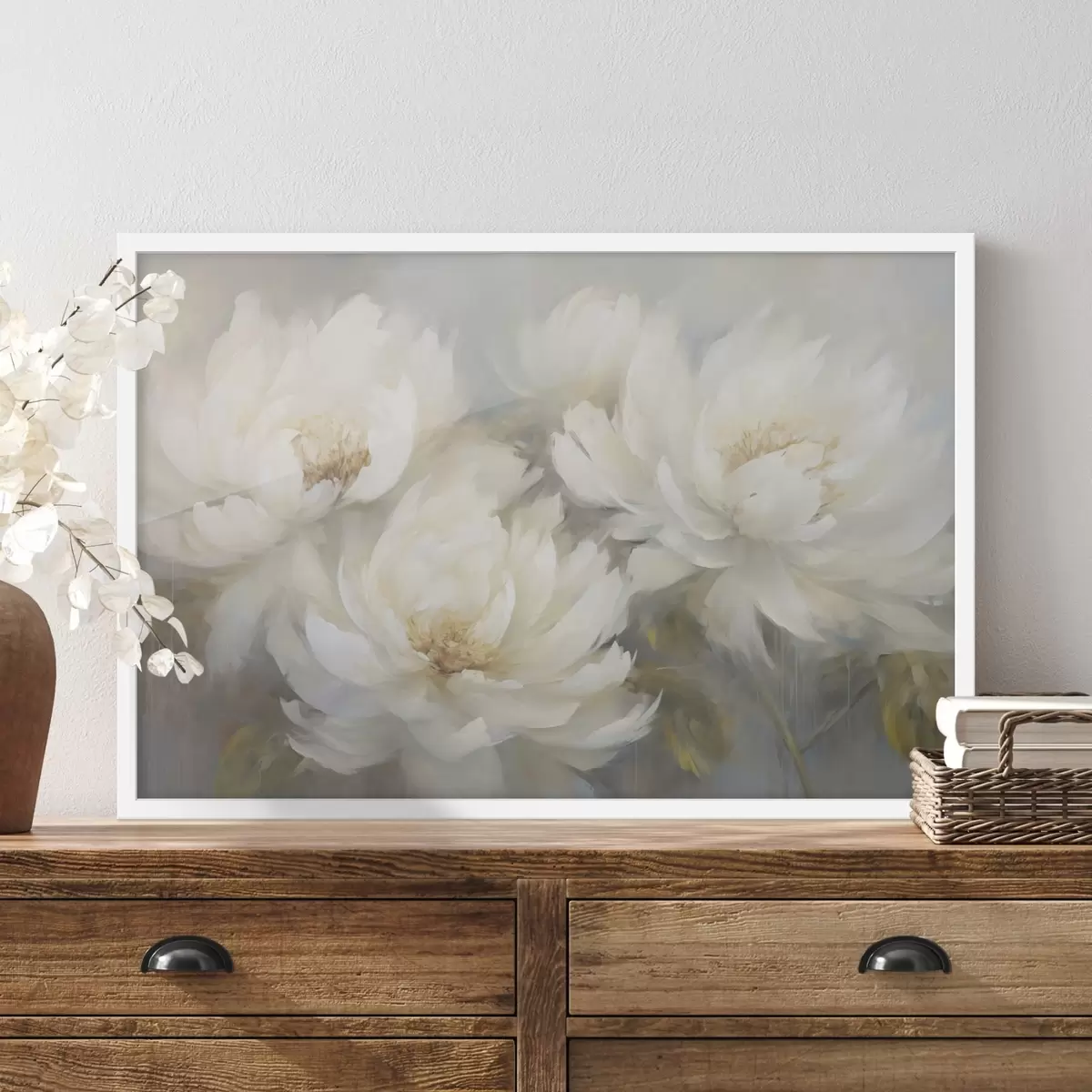 Poster Drie weelderige witte pioenrozen op een delicate achtergrond f45808