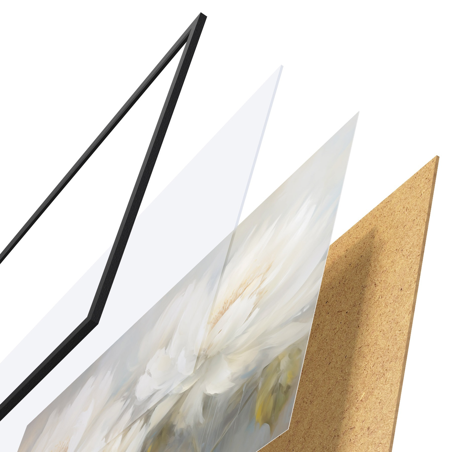 De poster bestaat uit een frame, plexiglas, geprinte afbeelding en spaanplaat achterkant. De poster kan meteen aan de muur worden gehangen dankzij de bevestigingen op de achterkant.