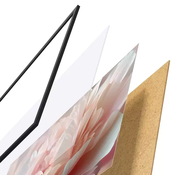 De poster bestaat uit een frame, plexiglas, geprinte afbeelding en spaanplaat achterkant. De poster kan meteen aan de muur worden gehangen dankzij de bevestigingen op de achterkant.