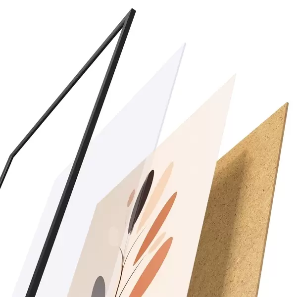 De poster bestaat uit een frame, plexiglas, geprinte afbeelding en spaanplaat achterkant. De poster kan meteen aan de muur worden gehangen dankzij de bevestigingen op de achterkant.