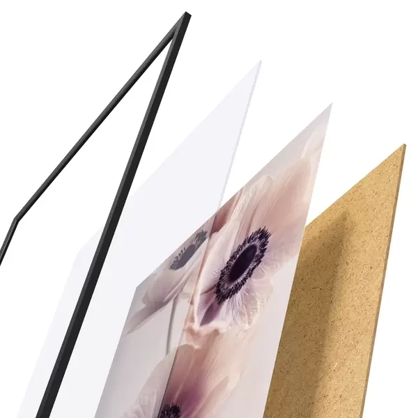 De poster bestaat uit een frame, plexiglas, geprinte afbeelding en spaanplaat achterkant. De poster kan meteen aan de muur worden gehangen dankzij de bevestigingen op de achterkant.