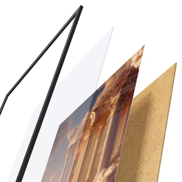 De poster bestaat uit een frame, plexiglas, geprinte afbeelding en spaanplaat achterkant. De poster kan meteen aan de muur worden gehangen dankzij de bevestigingen op de achterkant.