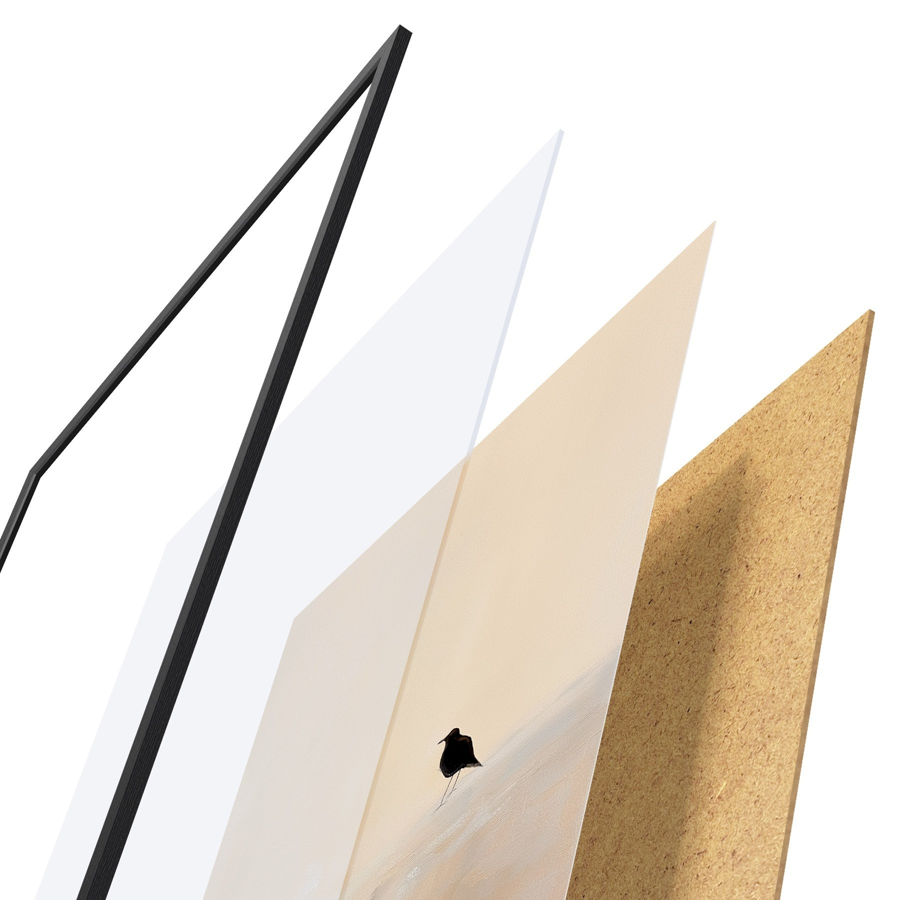 De poster bestaat uit een frame, plexiglas, geprinte afbeelding en spaanplaat achterkant. De poster kan meteen aan de muur worden gehangen dankzij de bevestigingen op de achterkant.