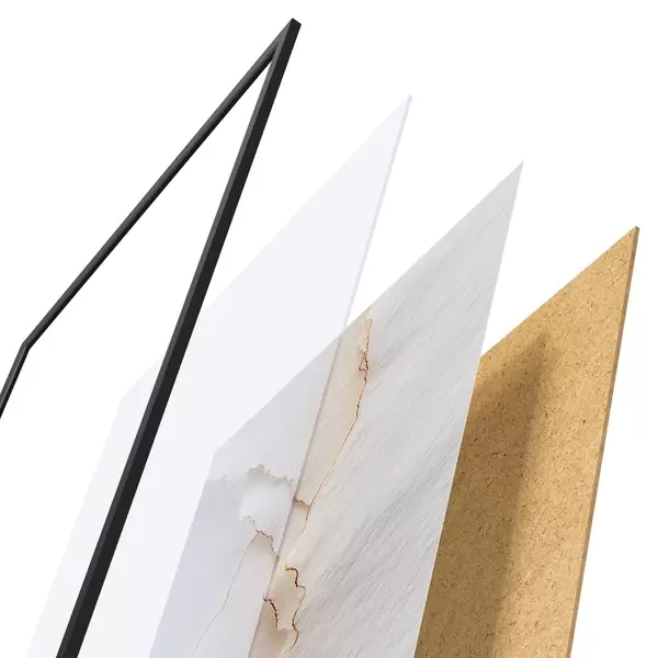 De poster bestaat uit een frame, plexiglas, geprinte afbeelding en spaanplaat achterkant. De poster kan meteen aan de muur worden gehangen dankzij de bevestigingen op de achterkant.