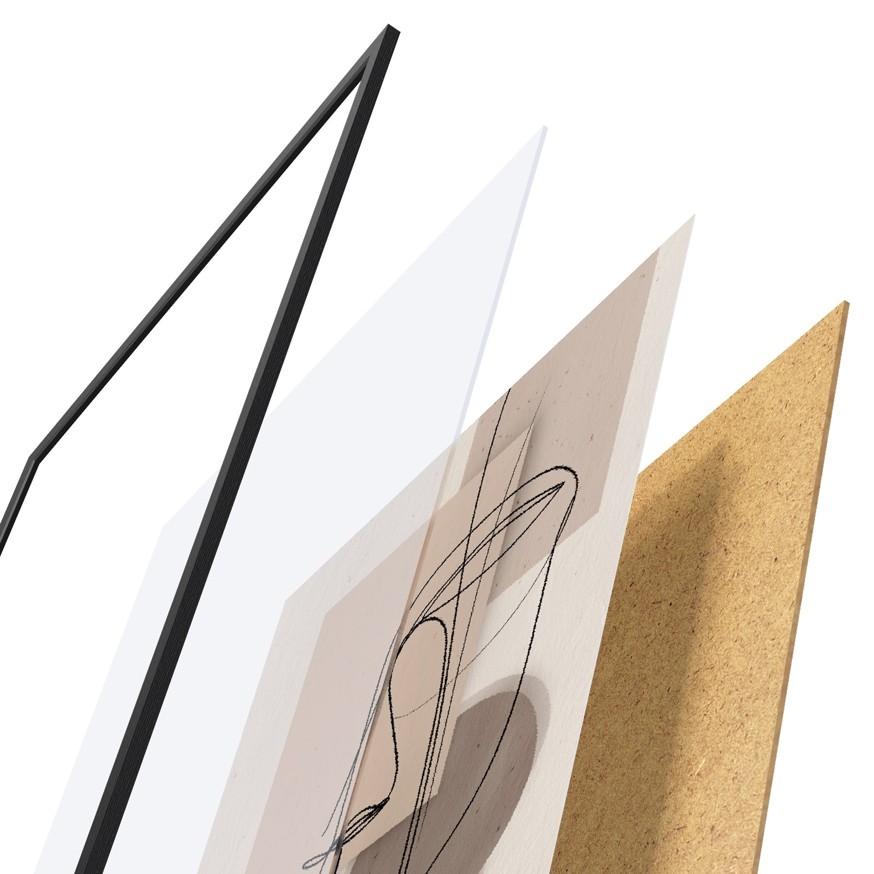 De poster bestaat uit een frame, plexiglas, geprinte afbeelding en spaanplaat achterkant. De poster kan meteen aan de muur worden gehangen dankzij de bevestigingen op de achterkant.