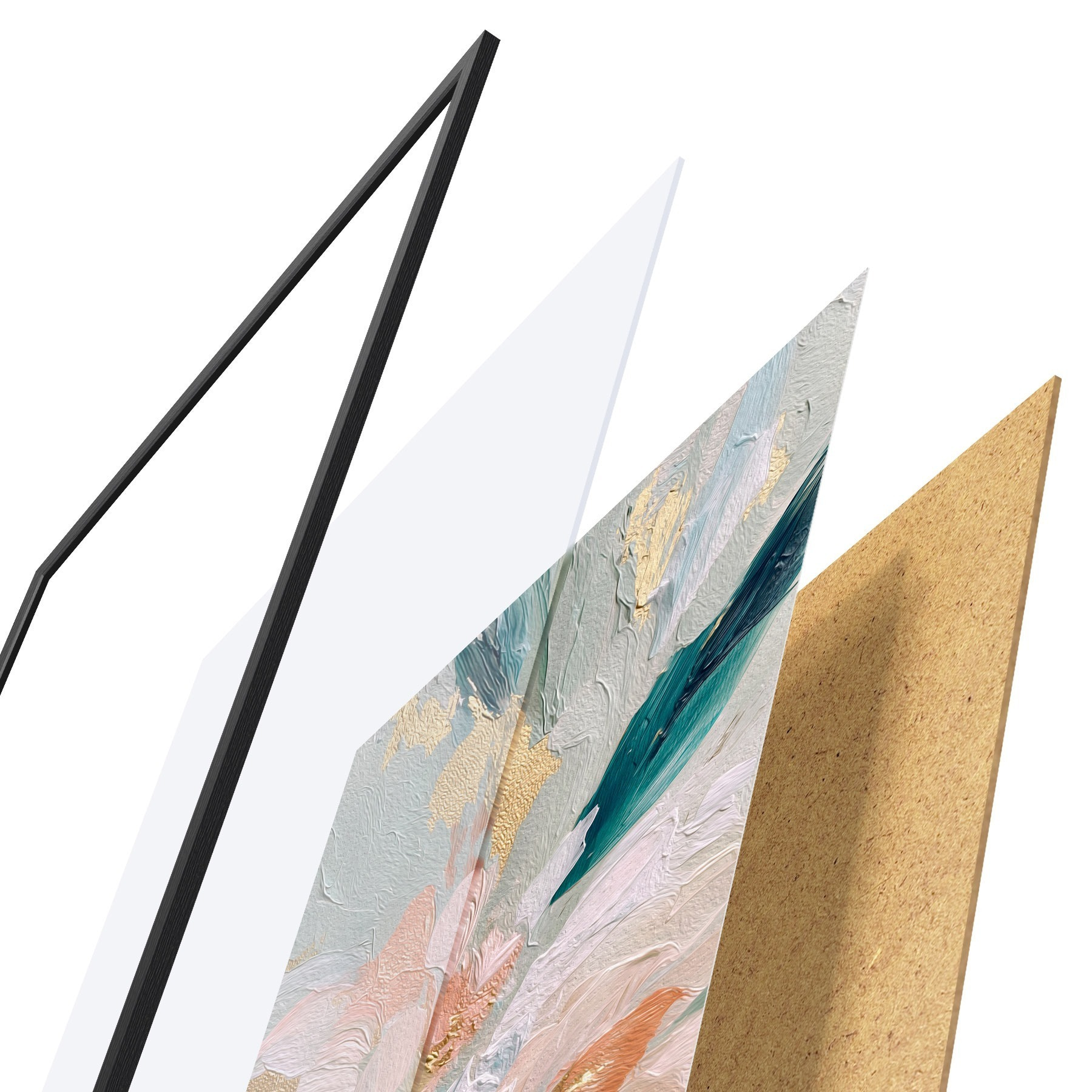 De poster bestaat uit een frame, plexiglas, geprinte afbeelding en spaanplaat achterkant. De poster kan meteen aan de muur worden gehangen dankzij de bevestigingen op de achterkant.
