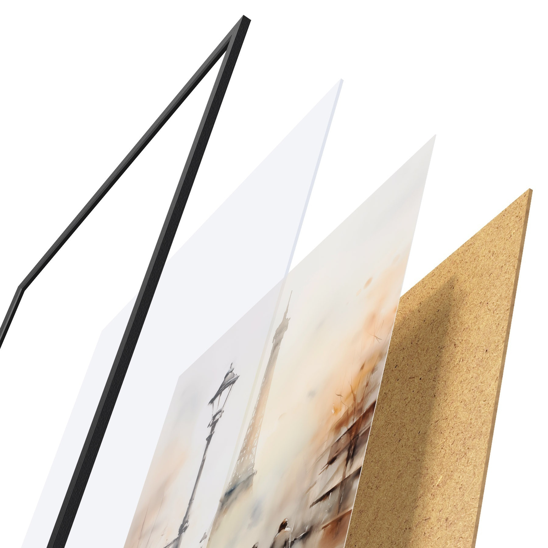 De poster bestaat uit een frame, plexiglas, geprinte afbeelding en spaanplaat achterkant. De poster kan meteen aan de muur worden gehangen dankzij de bevestigingen op de achterkant.