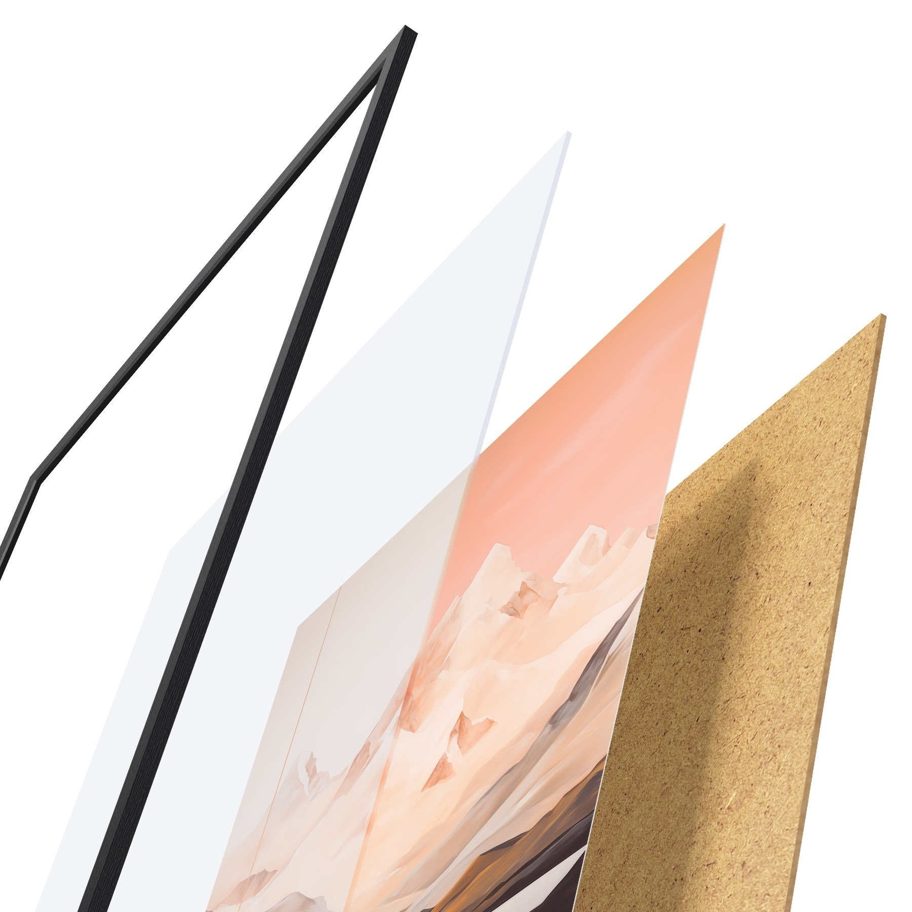 De poster bestaat uit een frame, plexiglas, geprinte afbeelding en spaanplaat achterkant. De poster kan meteen aan de muur worden gehangen dankzij de bevestigingen op de achterkant.