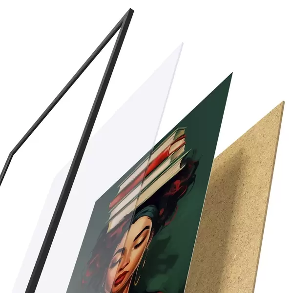 De poster bestaat uit een frame, plexiglas, geprinte afbeelding en spaanplaat achterkant. De poster kan meteen aan de muur worden gehangen dankzij de bevestigingen op de achterkant.