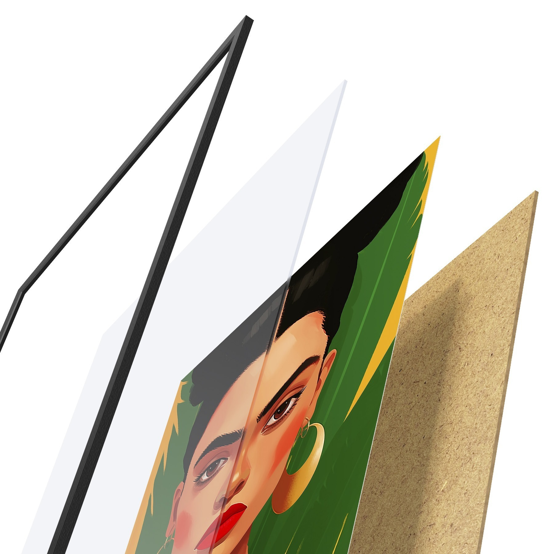 De poster bestaat uit een frame, plexiglas, geprinte afbeelding en spaanplaat achterkant. De poster kan meteen aan de muur worden gehangen dankzij de bevestigingen op de achterkant.