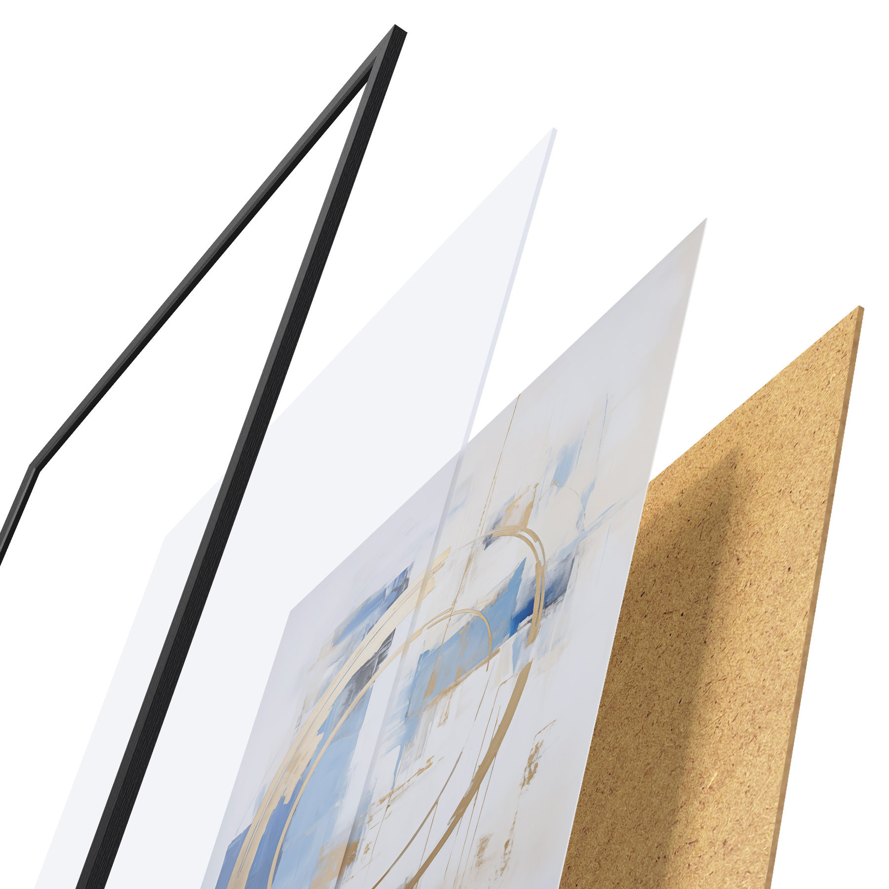 De poster bestaat uit een frame, plexiglas, geprinte afbeelding en spaanplaat achterkant. De poster kan meteen aan de muur worden gehangen dankzij de bevestigingen op de achterkant.