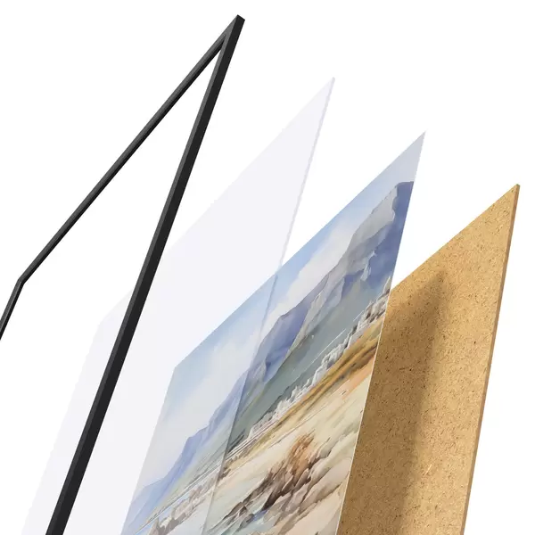 De poster bestaat uit een frame, plexiglas, geprinte afbeelding en spaanplaat achterkant. De poster kan meteen aan de muur worden gehangen dankzij de bevestigingen op de achterkant.