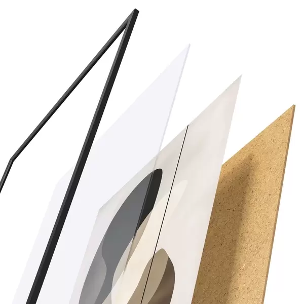 De poster bestaat uit een frame, plexiglas, geprinte afbeelding en spaanplaat achterkant. De poster kan meteen aan de muur worden gehangen dankzij de bevestigingen op de achterkant.