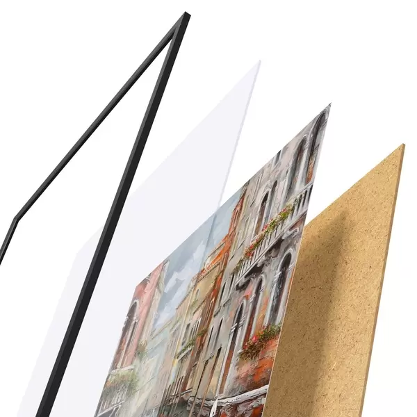 De poster bestaat uit een frame, plexiglas, geprinte afbeelding en spaanplaat achterkant. De poster kan meteen aan de muur worden gehangen dankzij de bevestigingen op de achterkant.
