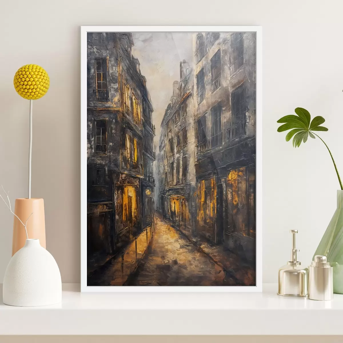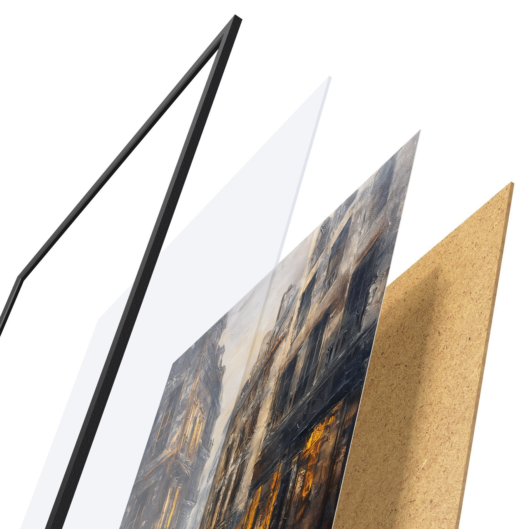 De poster bestaat uit een frame, plexiglas, geprinte afbeelding en spaanplaat achterkant. De poster kan meteen aan de muur worden gehangen dankzij de bevestigingen op de achterkant.