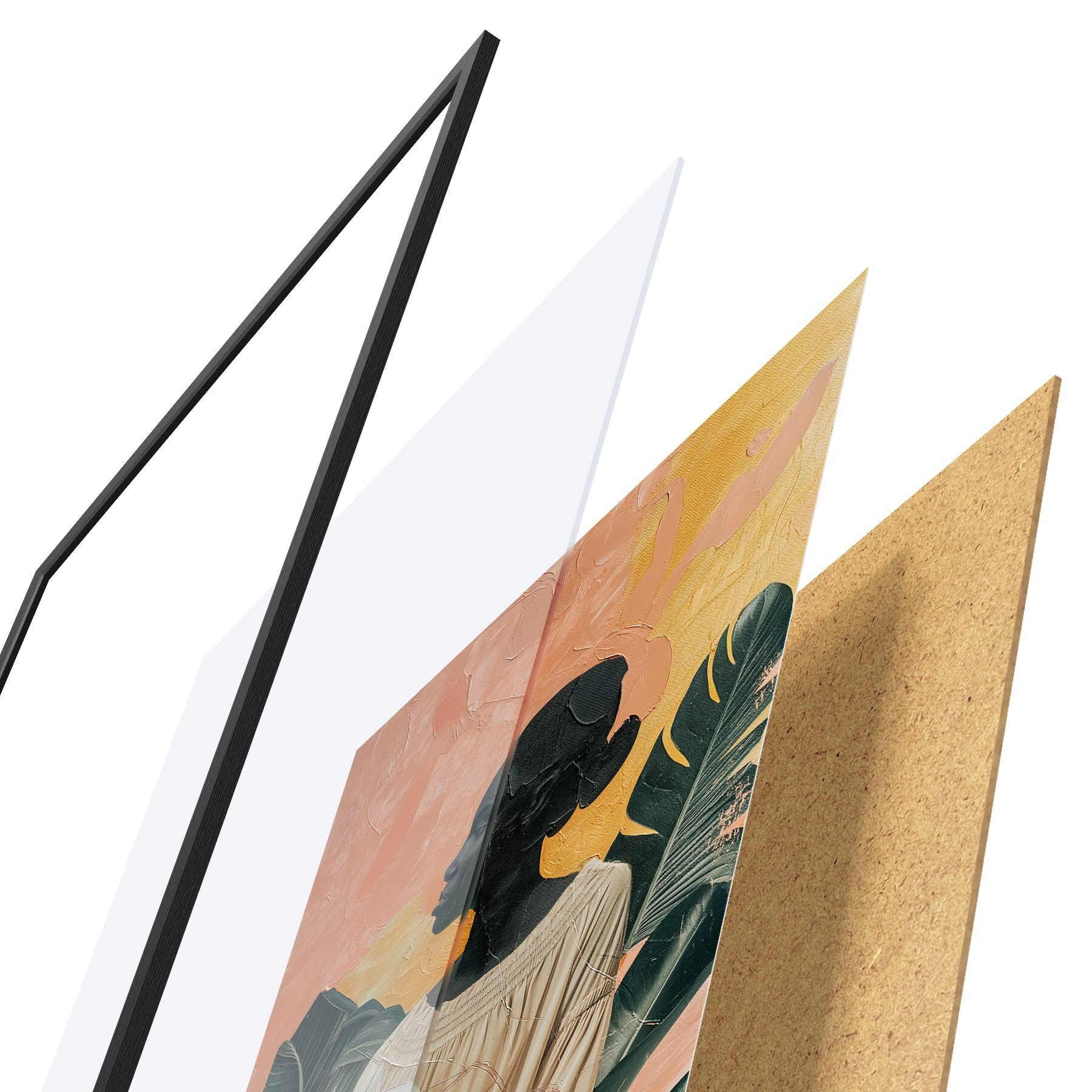 De poster bestaat uit een frame, plexiglas, geprinte afbeelding en spaanplaat achterkant. De poster kan meteen aan de muur worden gehangen dankzij de bevestigingen op de achterkant.