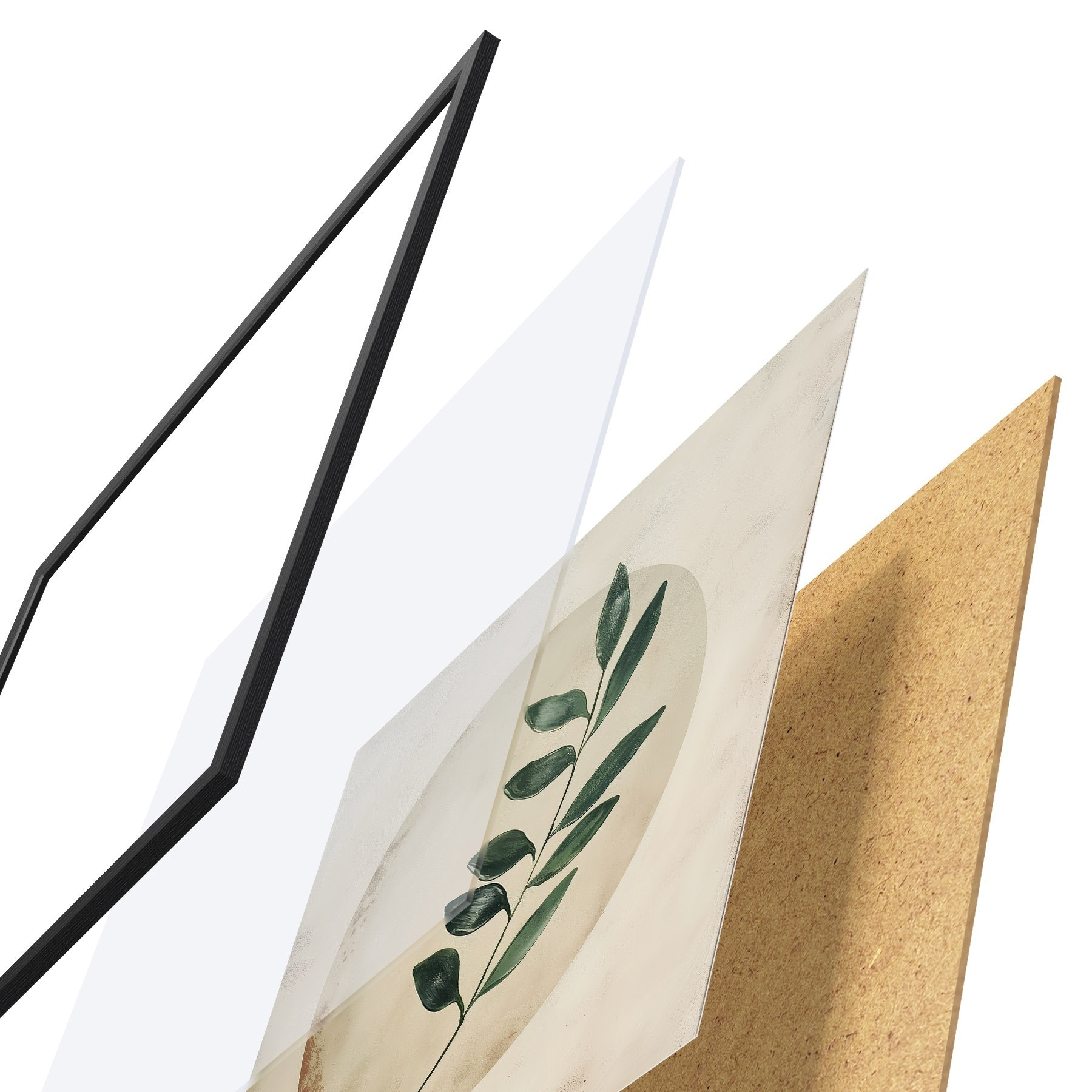De poster bestaat uit een frame, plexiglas, geprinte afbeelding en spaanplaat achterkant. De poster kan meteen aan de muur worden gehangen dankzij de bevestigingen op de achterkant.