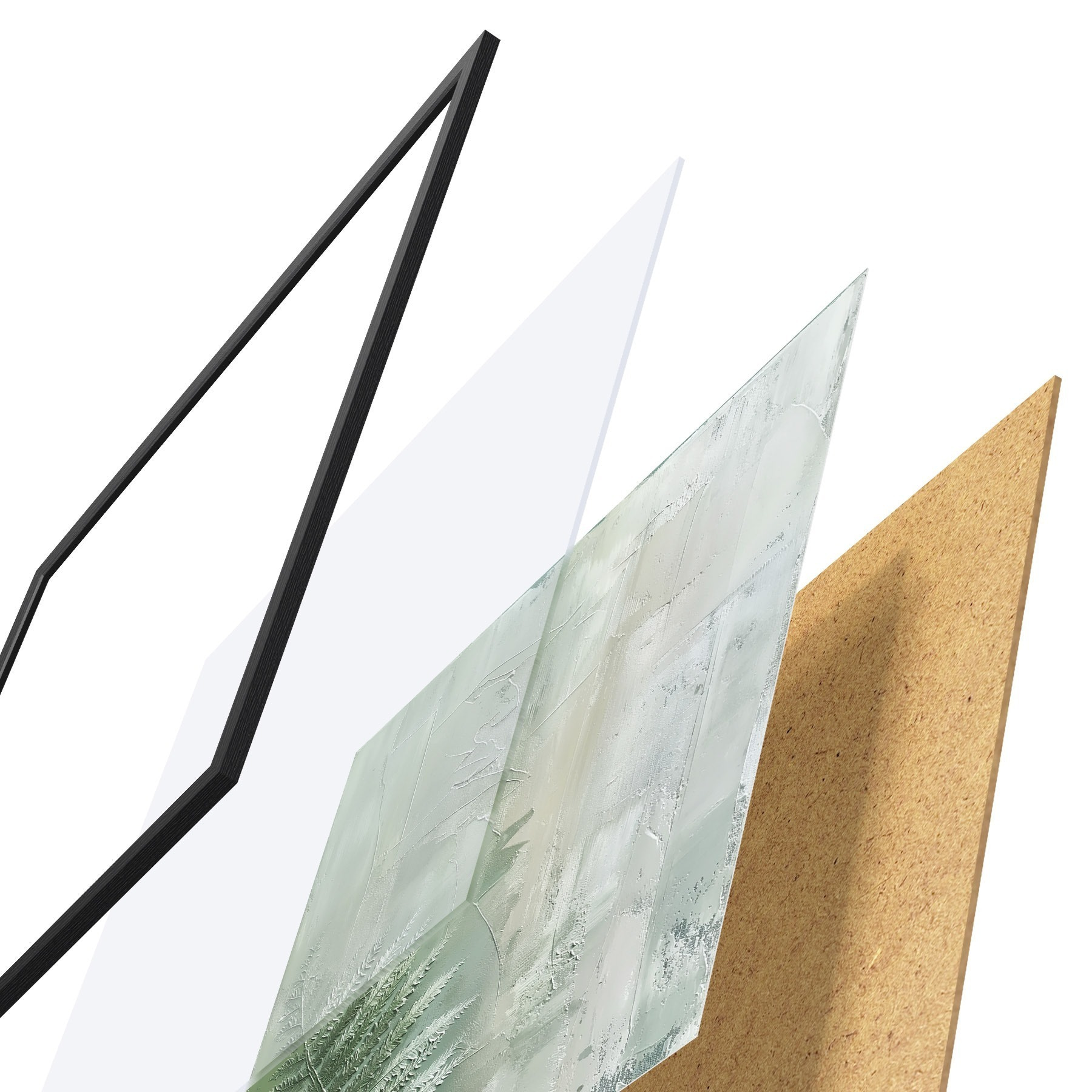De poster bestaat uit een frame, plexiglas, geprinte afbeelding en spaanplaat achterkant. De poster kan meteen aan de muur worden gehangen dankzij de bevestigingen op de achterkant.