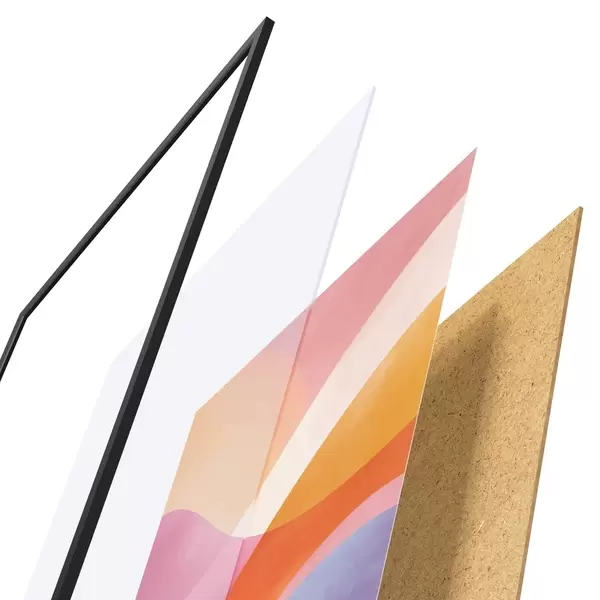 De poster bestaat uit een frame, plexiglas, geprinte afbeelding en spaanplaat achterkant. De poster kan meteen aan de muur worden gehangen dankzij de bevestigingen op de achterkant.
