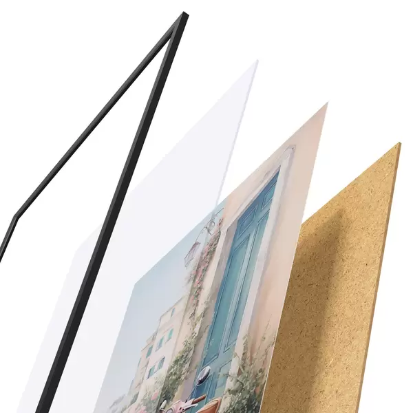 De poster bestaat uit een frame, plexiglas, geprinte afbeelding en spaanplaat achterkant. De poster kan meteen aan de muur worden gehangen dankzij de bevestigingen op de achterkant.