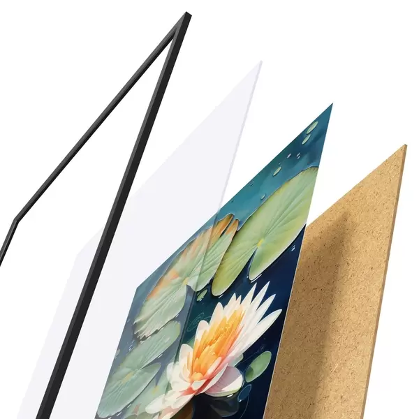 De poster bestaat uit een frame, plexiglas, geprinte afbeelding en spaanplaat achterkant. De poster kan meteen aan de muur worden gehangen dankzij de bevestigingen op de achterkant.