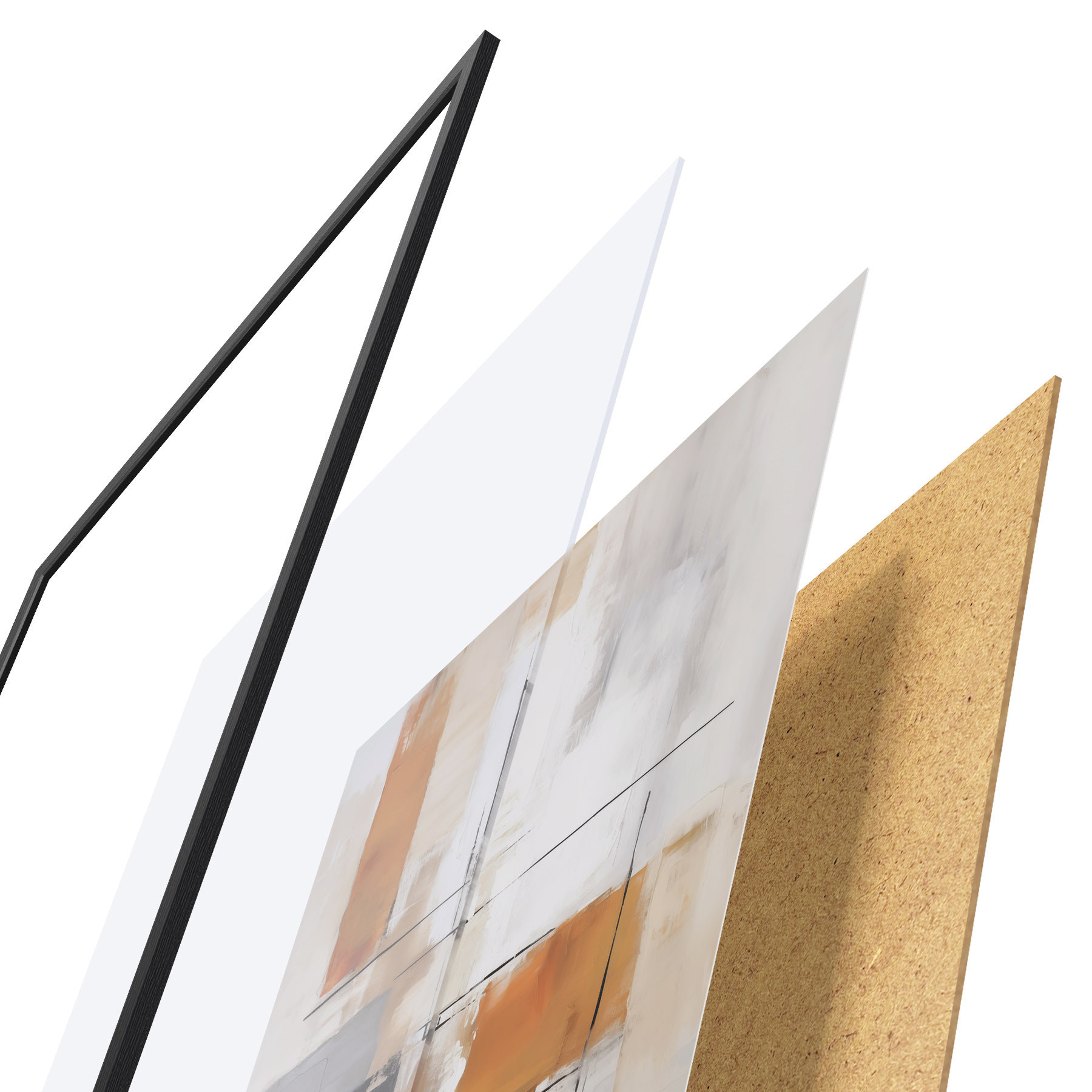 De poster bestaat uit een frame, plexiglas, geprinte afbeelding en spaanplaat achterkant. De poster kan meteen aan de muur worden gehangen dankzij de bevestigingen op de achterkant.