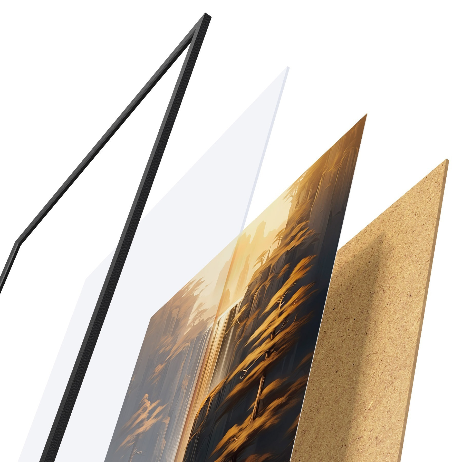 De poster bestaat uit een frame, plexiglas, geprinte afbeelding en spaanplaat achterkant. De poster kan meteen aan de muur worden gehangen dankzij de bevestigingen op de achterkant.