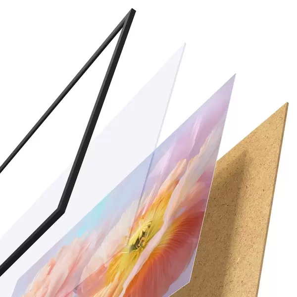 De poster bestaat uit een frame, plexiglas, geprinte afbeelding en spaanplaat achterkant. De poster kan meteen aan de muur worden gehangen dankzij de bevestigingen op de achterkant.