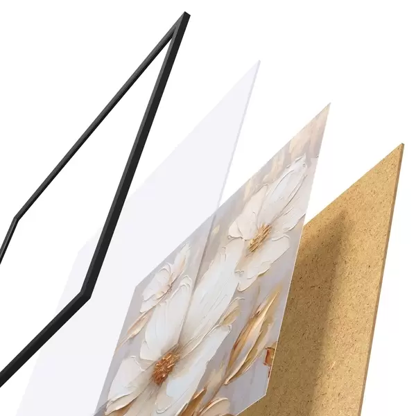 De poster bestaat uit een frame, plexiglas, geprinte afbeelding en spaanplaat achterkant. De poster kan meteen aan de muur worden gehangen dankzij de bevestigingen op de achterkant.