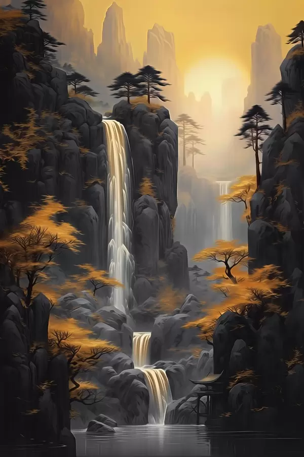 Poster Rotsachtig landschap met een waterval in warme zonsondergangtinten Nr f46177
